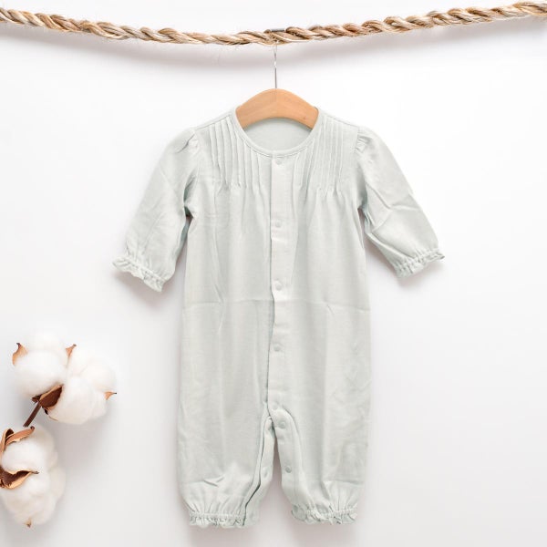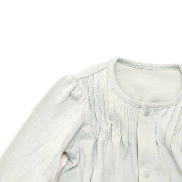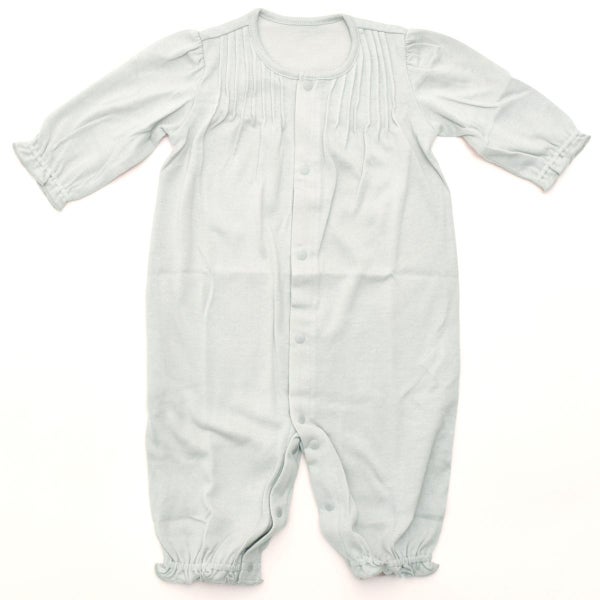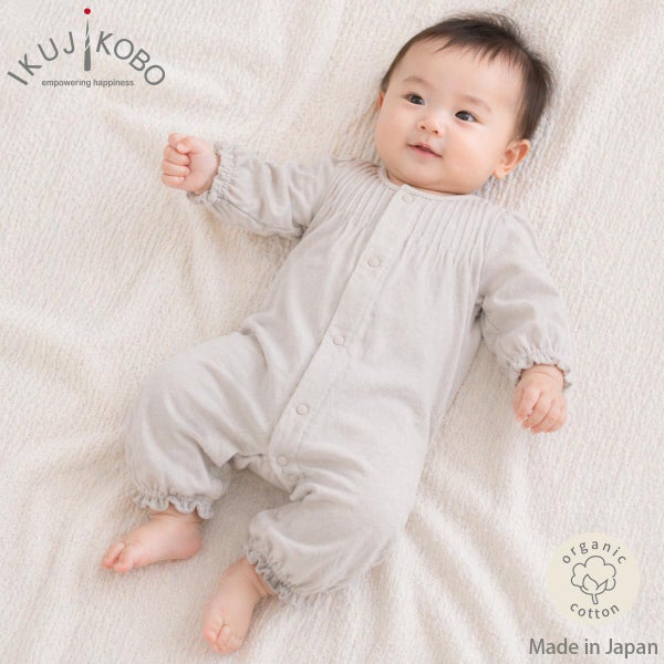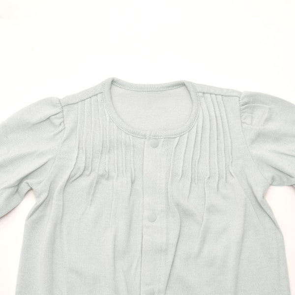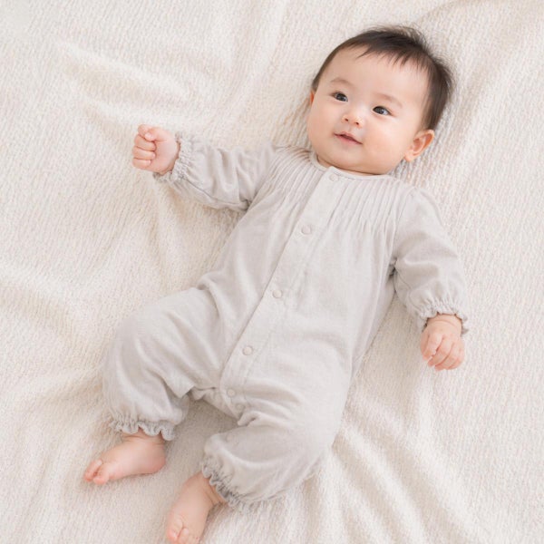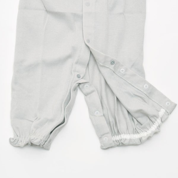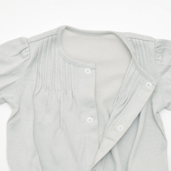 スナップボタンの前開きで大きく開くので、寝ている赤ちゃんのお着替えやおむつ替えも楽々です♪