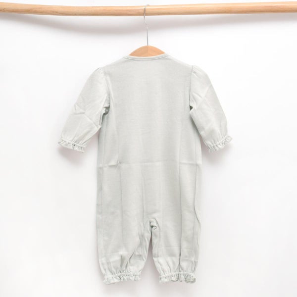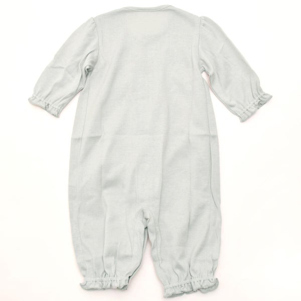 股下のスナップボタンの留め方で、新生児期はベビードレスとして。