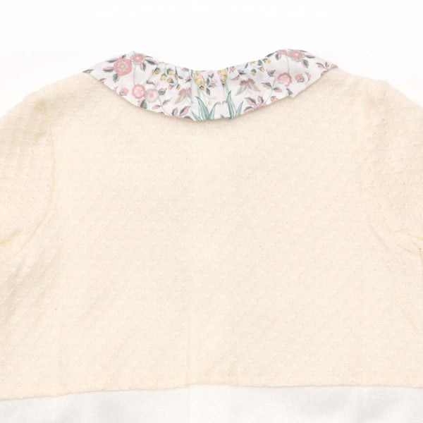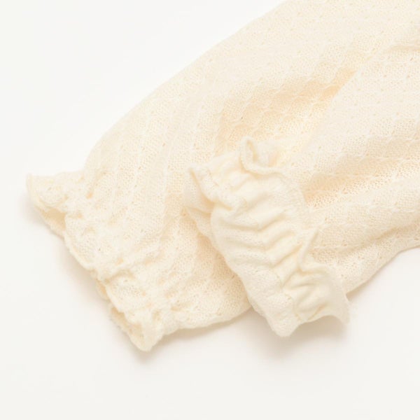 本体はホワイトの吊天竺、カーディガン部分はナチュラルな透かし編みになっています。