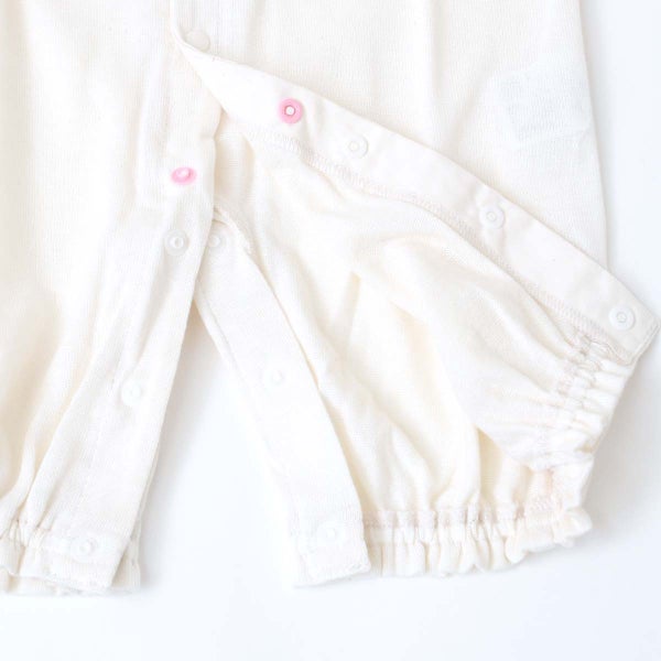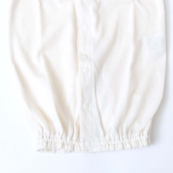 スナップボタンの前開きで大きく開くので、寝ている赤ちゃんのお着替えやおむつ替えも楽々です♪