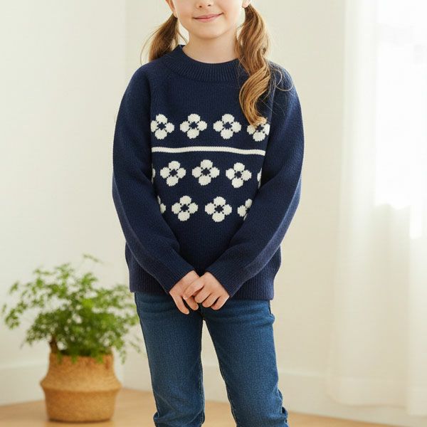 落ち着いた印象ならが花模様の可愛らしさも織り交ぜたノーブルなキッズセーター。