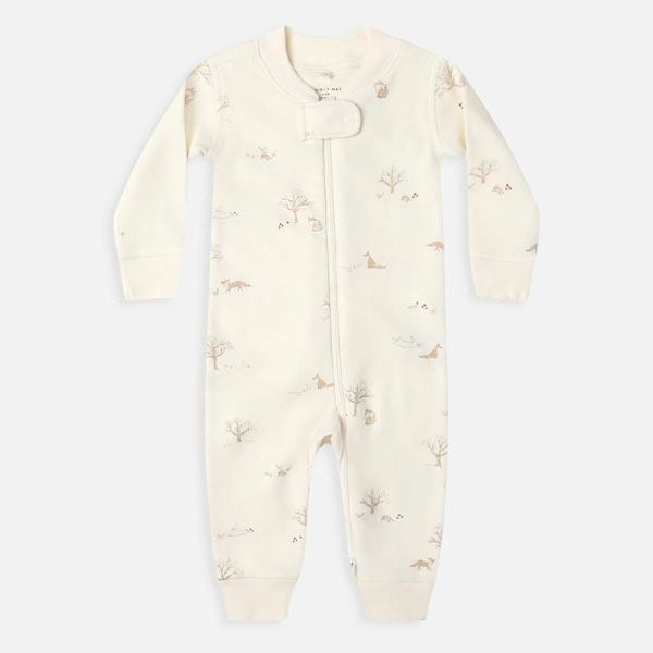 首元から足元までファスナーが大きく開くカバーオールは、お着替えやおむつ替えもスムーズに。