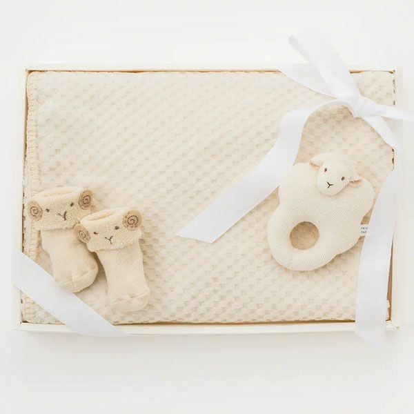 ひつじのがらがらと、ソックス、ふわふわのミニブランケットが入ったギフト3点セット♪