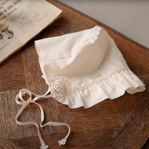 ボンネットとオーバードレスのお花は手編みボタンで、丁寧な手仕事の温かみをプラス