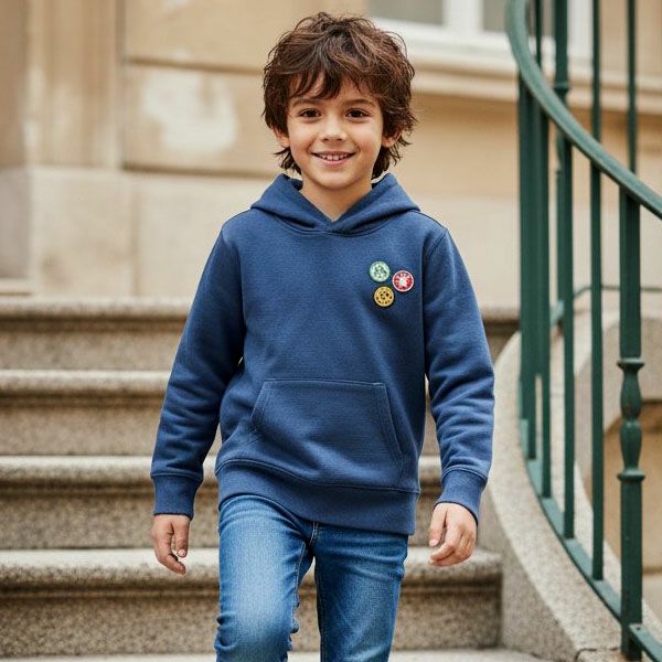 ソフトで軽量なスウェット素材を使用したキッズ向け長袖プルオーバーパーカー。