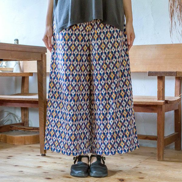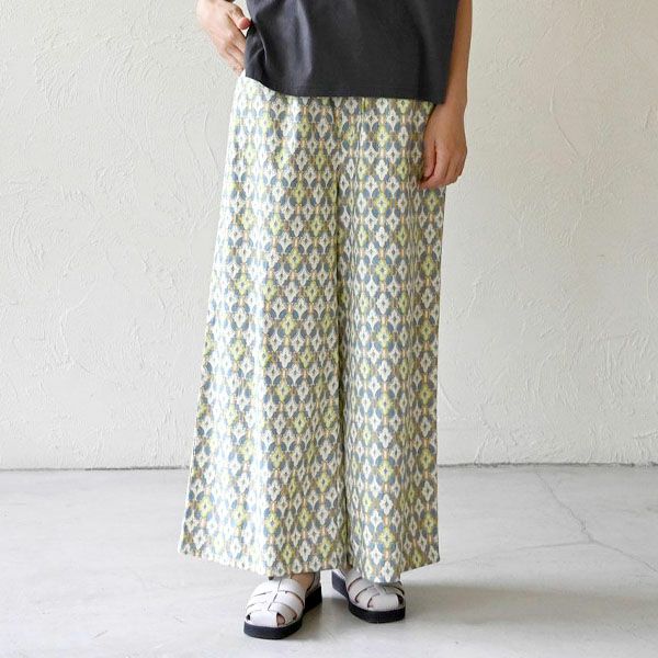 どこか異国の街角を思わせる、幾何学的な「タイルプリント」が美しいイージーパンツです。