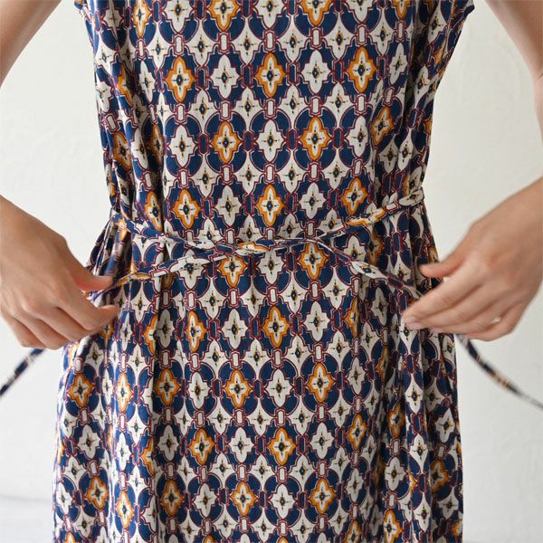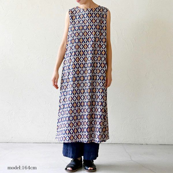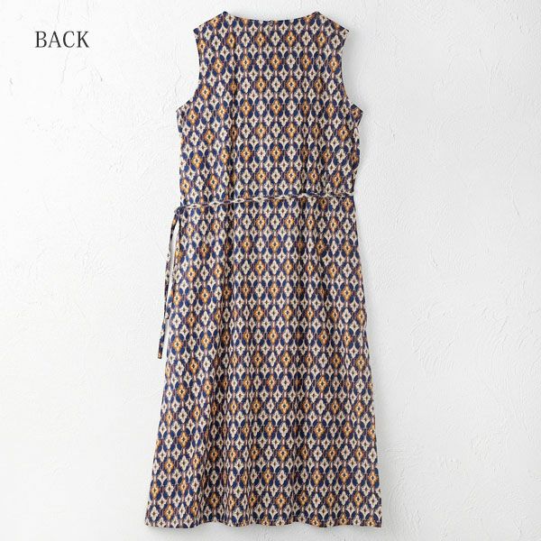 どこか異国の街角を思わせる、幾何学的な「タイルプリント」が美しいノースリーブワンピースです。