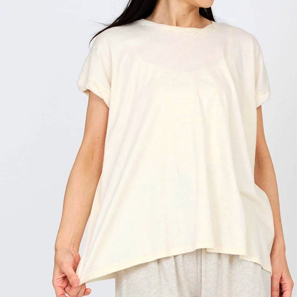 ドルマンスリーブでゆったりと心地よく着られる、肌ざわりがなめらかなトップス。