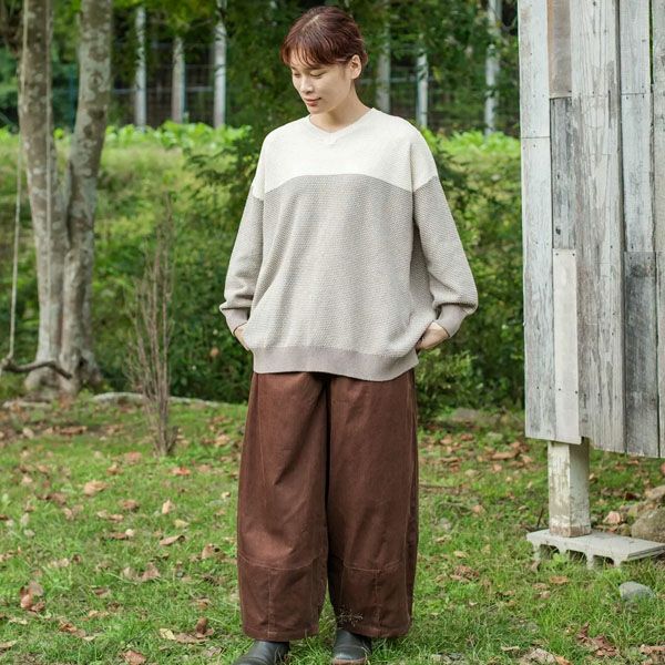 コットンニットとコーデュロイを合わせて、秋冬らしいあたたかみのあるコーデに。