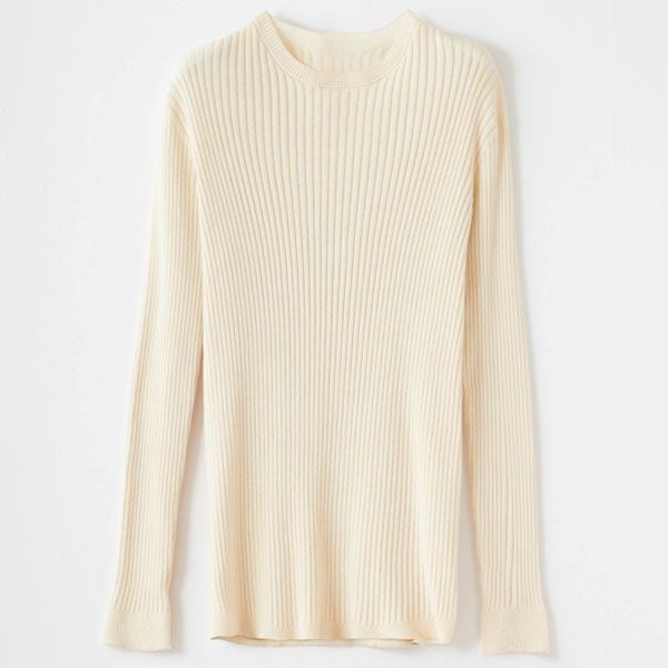 空気を含んだようにふんわりと軽く、伸びやかでチクチクしないやさしい肌ざわりのリブ編みは、薄手でもあたたかく重ねてももたつきません。