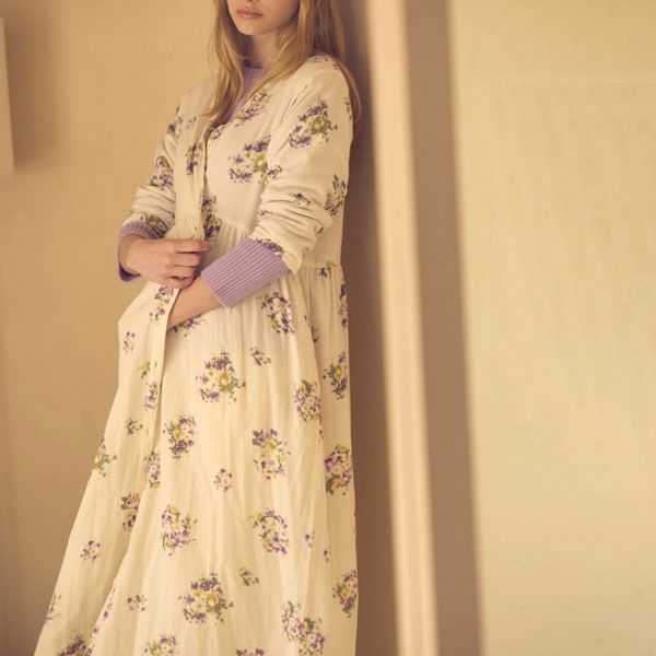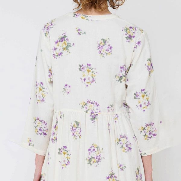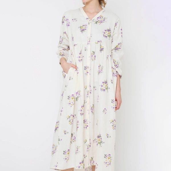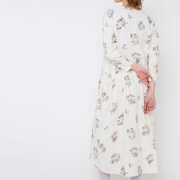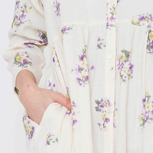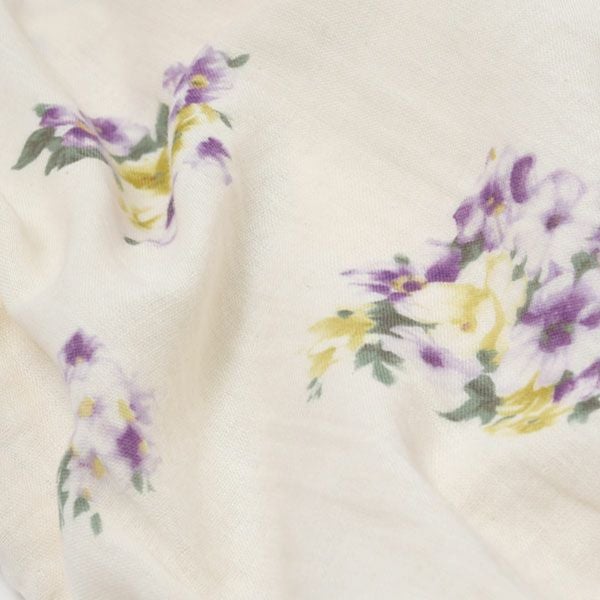 ナチュラルの生地に、静かで凛とした美しさのパープルの花柄プリント。